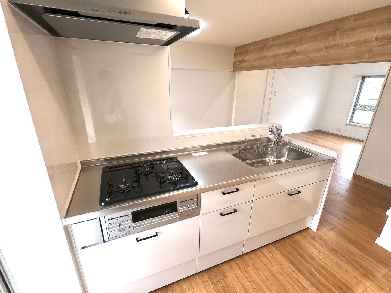 キッチンの背面側の壁には、タイル調クロスがアクセントになりとっても可愛くなりました。